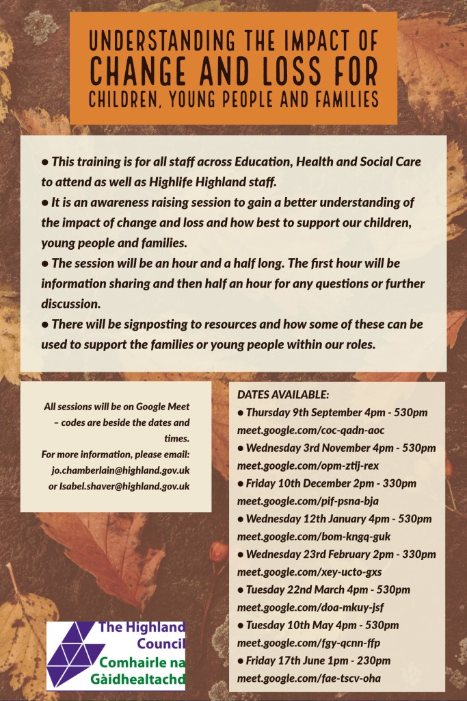 Our Understanding the Impact of change and loss for children, young people and families training will be offered throughout this session. If you are a member of staff looking to join us on this training please come along to one of our online sessions. Details below:
