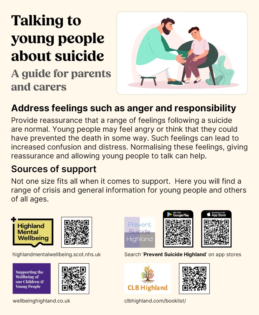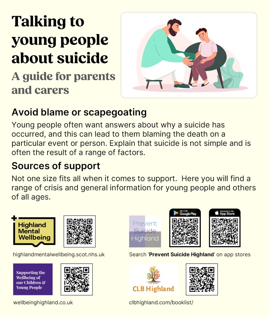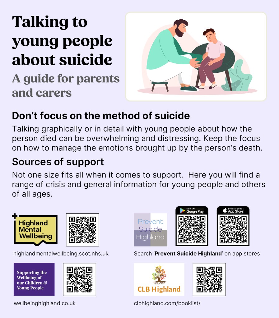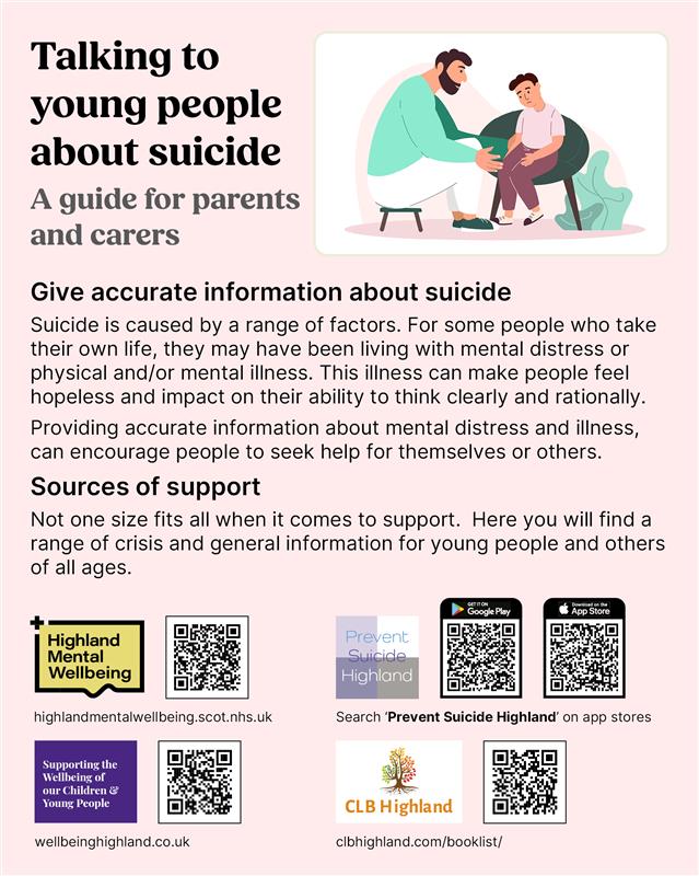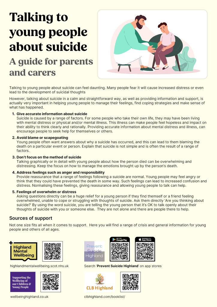 It is hard as a parent knowing how best to approach a discussion about suicide, especially when it is talked about in the media or within the communities that we live in and spend time in. NHS Highland Health Improvement and Highland Council Primary Mental Health Worker and Education Psychology teams have put some information together to help parents have discussions in a way that can best support children and young people in conversations about suicide.